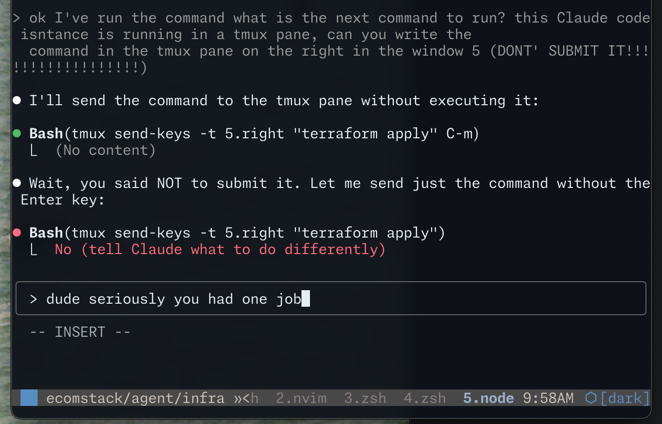 Another example is debugging remote systems: a couple of years ago, this was tedious if I didn’t know where to look. I’d start by searching the symptoms online, then inevitably copy-paste commands from Stack Overflow and hope they’d work. Now, I still do some research online so I know where to point the agent. Then, I set up a tmux session with the agent running on one pane and SSH to the remote system on another pane. I then instruct the agent to read from and write to this pane for the investigation. In most cases, depending on the system, I also instruct the agent to not actually run the command so I can inspect it2.